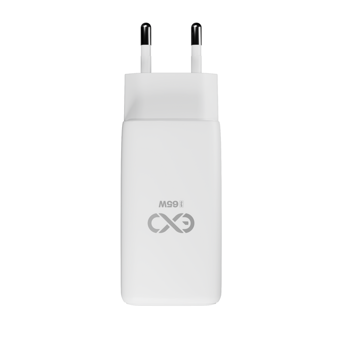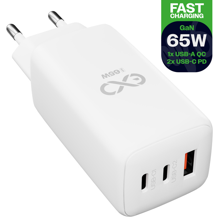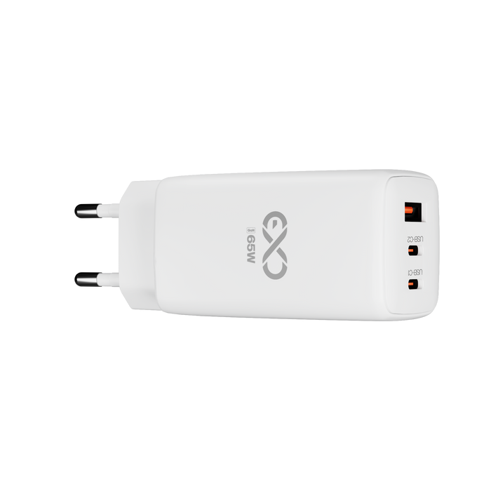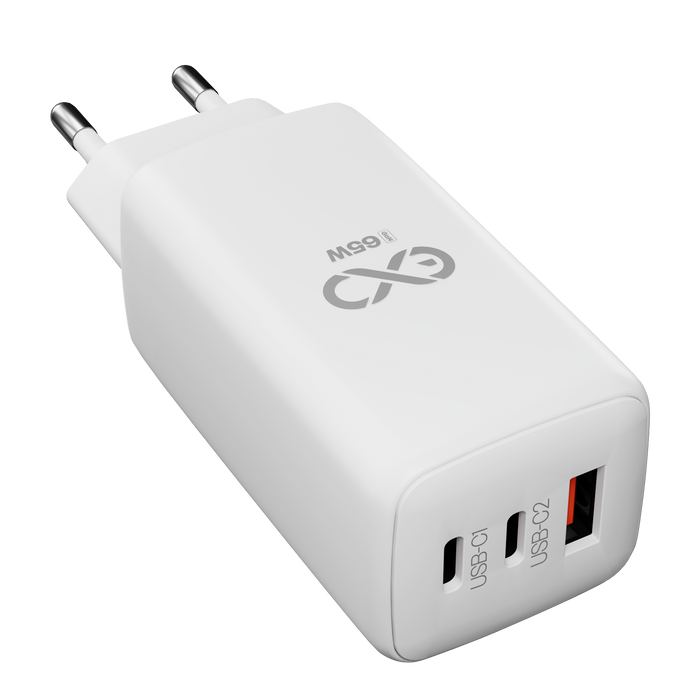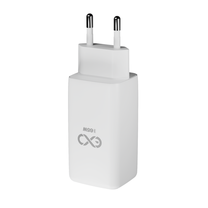 Uniwersalna szybka ładowarka sieciowa eXc CUBE, 1x USB-A QC + 2x USB-C PD, 65W, biała