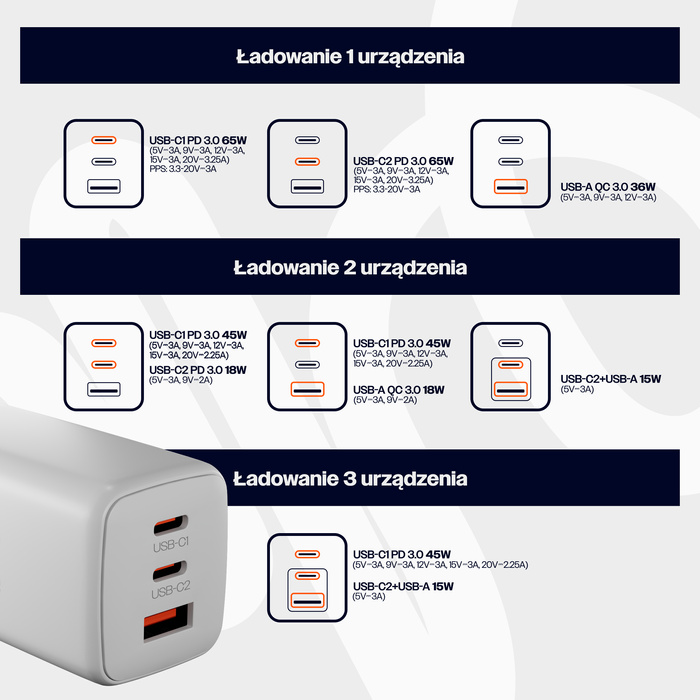 Dzięki połączeniu technologii Power Delivery, Quick Charge, GaN oraz inteligentnego zarządzania energią możesz ładować swoje urządzenia szybko, bezpiecznie i bez kompromisów — w domu, w pracy i w podróży.