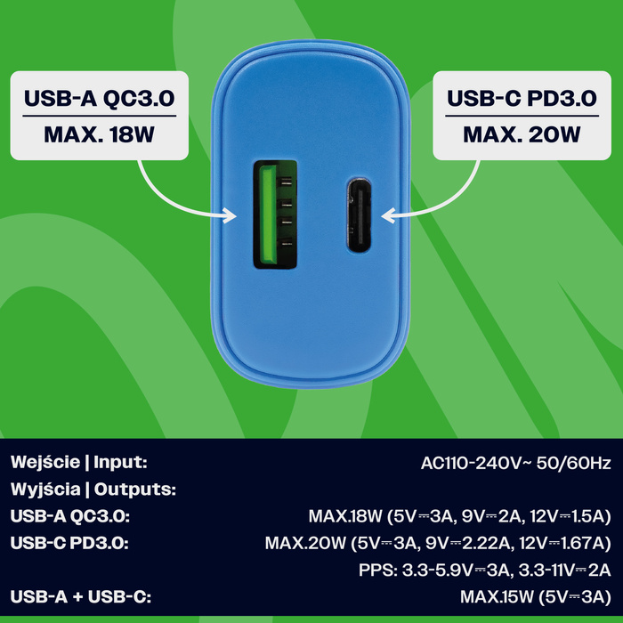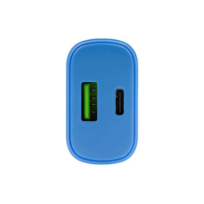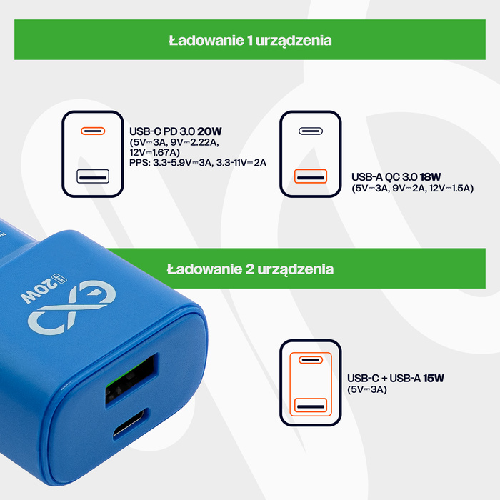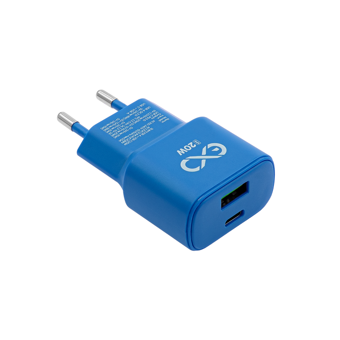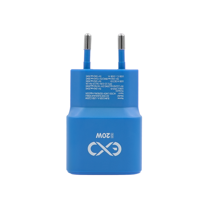 Uniwersalna szybka ładowarka sieciowa eXc SLIM, 1x USB-A QC + 1x USB-C PD, 20W, rozlany cyan