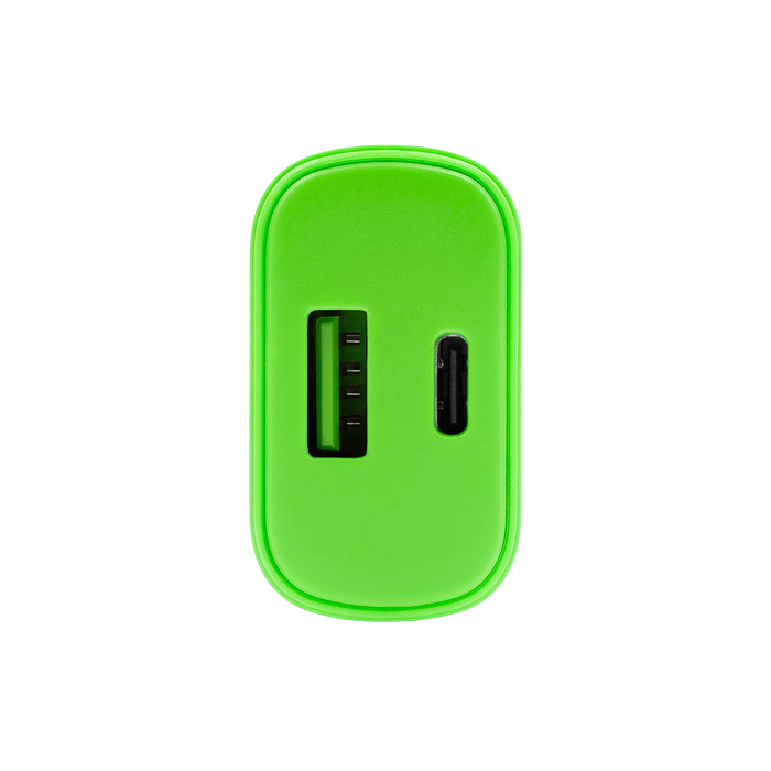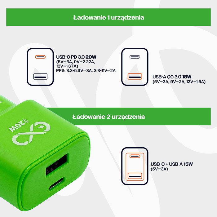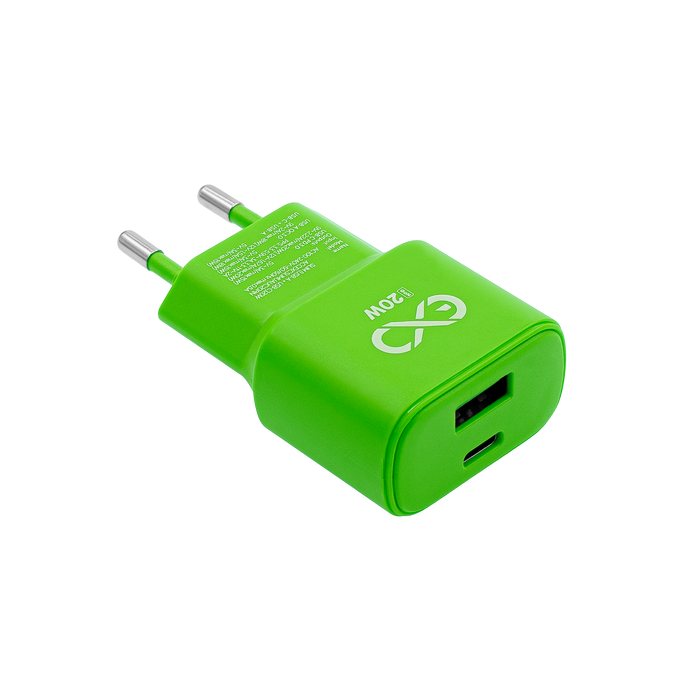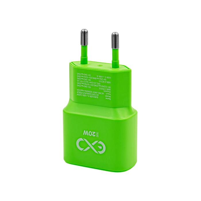 Uniwersalna szybka ładowarka sieciowa eXc SLIM, 1x USB-A QC + 1x USB-C PD, 20W, neonowo zielona