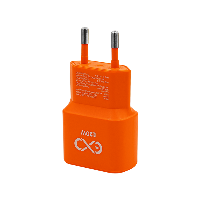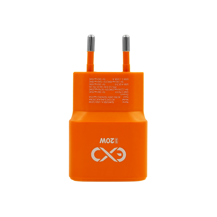 Uniwersalna szybka ładowarka sieciowa eXc SLIM, 1x USB-A QC + 1x USB-C PD, 20W, pomarańczowa