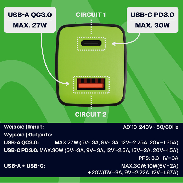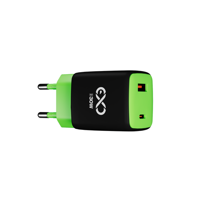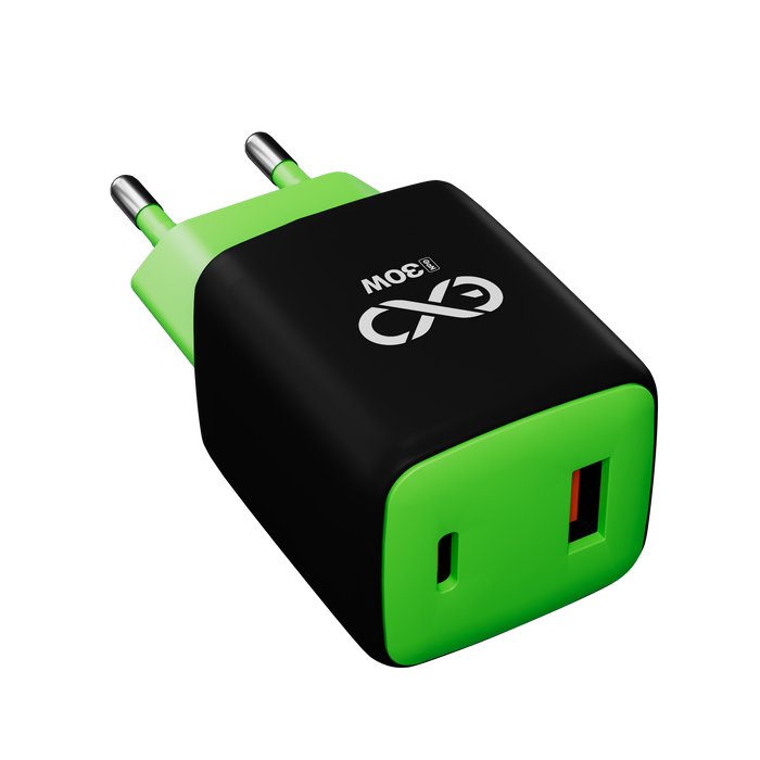 Uniwersalna szybka ładowarka sieciowa eXc CUBE, 1x USB-A QC + 1x USB-C PD, 30W, czarno-neonowo zielona